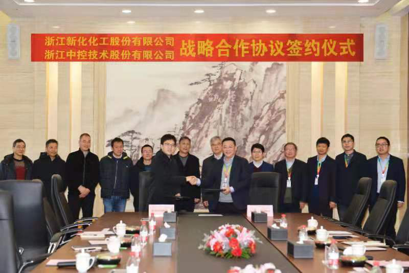 浙江新化副总经理应思斌(左)与浙江中控总裁助理郭飚(右)成功签约战略合作协议