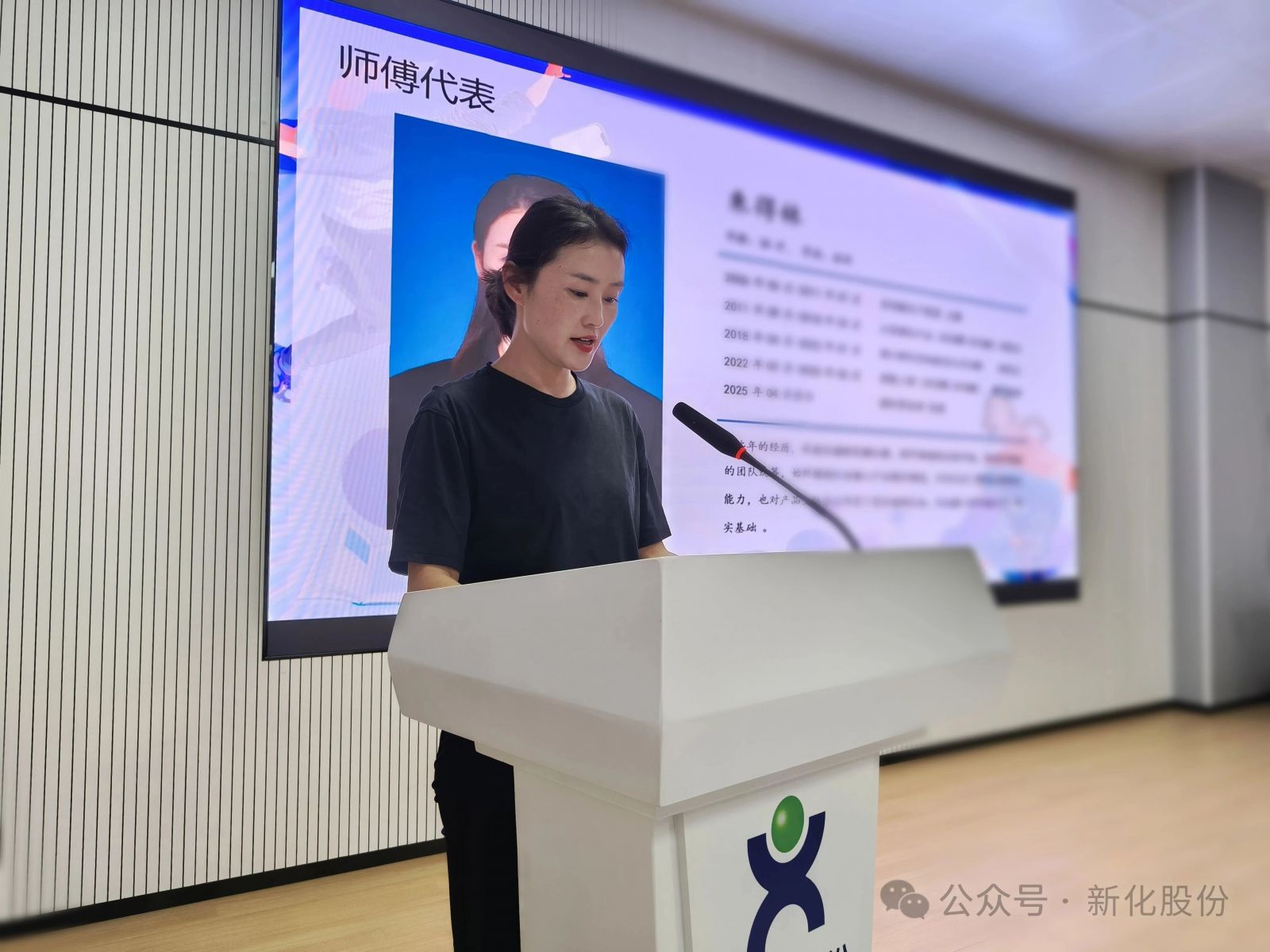 授旗仪式后,“薪火相传”环节接续登场,成为传承新化匠心的生动载体。师傅代表、公司资深业务骨干朱得林同志结合自身在新化19 年的成长历程,分享了从职场新人到“技术能手”的奋斗故事。“薪火不是简单的技能传递,而是‘把事情做到极致’的信念接力。”她笑着对新员工说,“期待你们接过这根‘接力棒’,在岗位上打磨真本领,让青春在实干中闪光。”